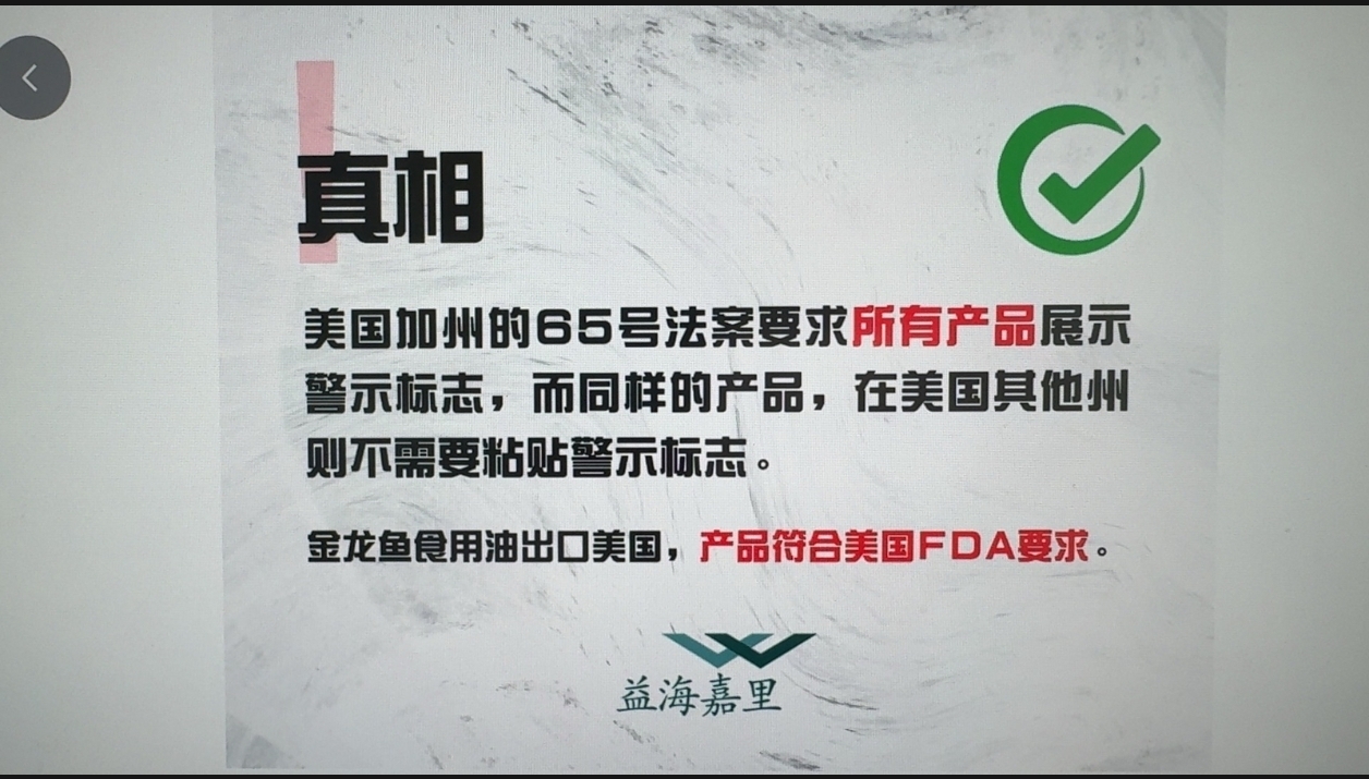 美国加州65号法令要求所有产品都要贴这个标签,金龙鱼能上美国超市的货架,这本身就