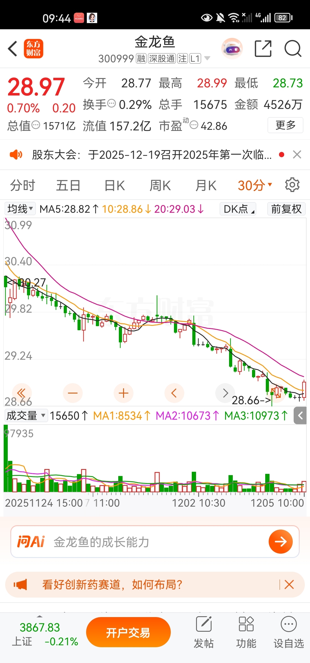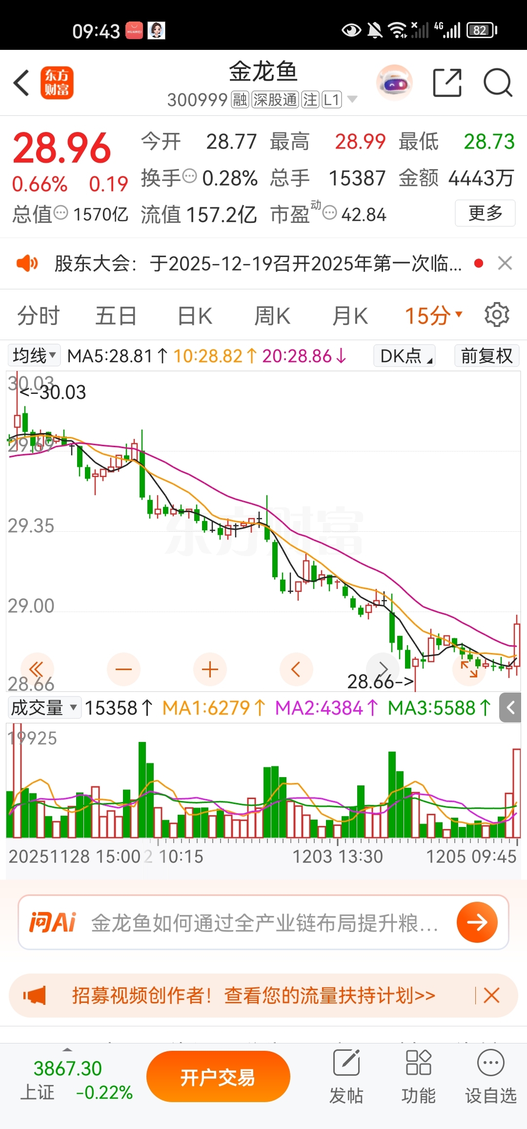 不过,乐观之余更需保持理性。尽管15分钟线传递出积极信号,但30分钟线的弱势尚未扭转,这意味着短期趋势的反转仍缺乏足够支撑。历史经验早已证明,“底从来不是一个精确的点位,而是一个区域”,即便金龙鱼已处于历史低位,也不代表股价不会继续下探。当前空头虽未像昨日那般疯狂砸盘,但并未完全退场,若后续市场情绪再度恶化,或空头重拾砸盘力度,股价仍有考验更低支撑位的可能。