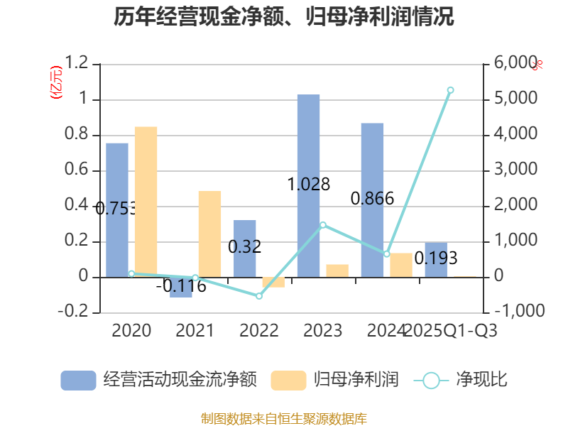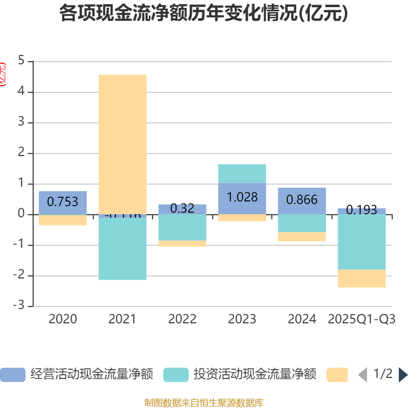 2025年前三季度,公司经营活动现金流净额为1930.91万元,同比下降69.05%;筹资活动现金流净额-5829.87万元,同比减少4091.78万元;投资活动现金流净额-1.81亿元,上年同期为-1.78亿元。