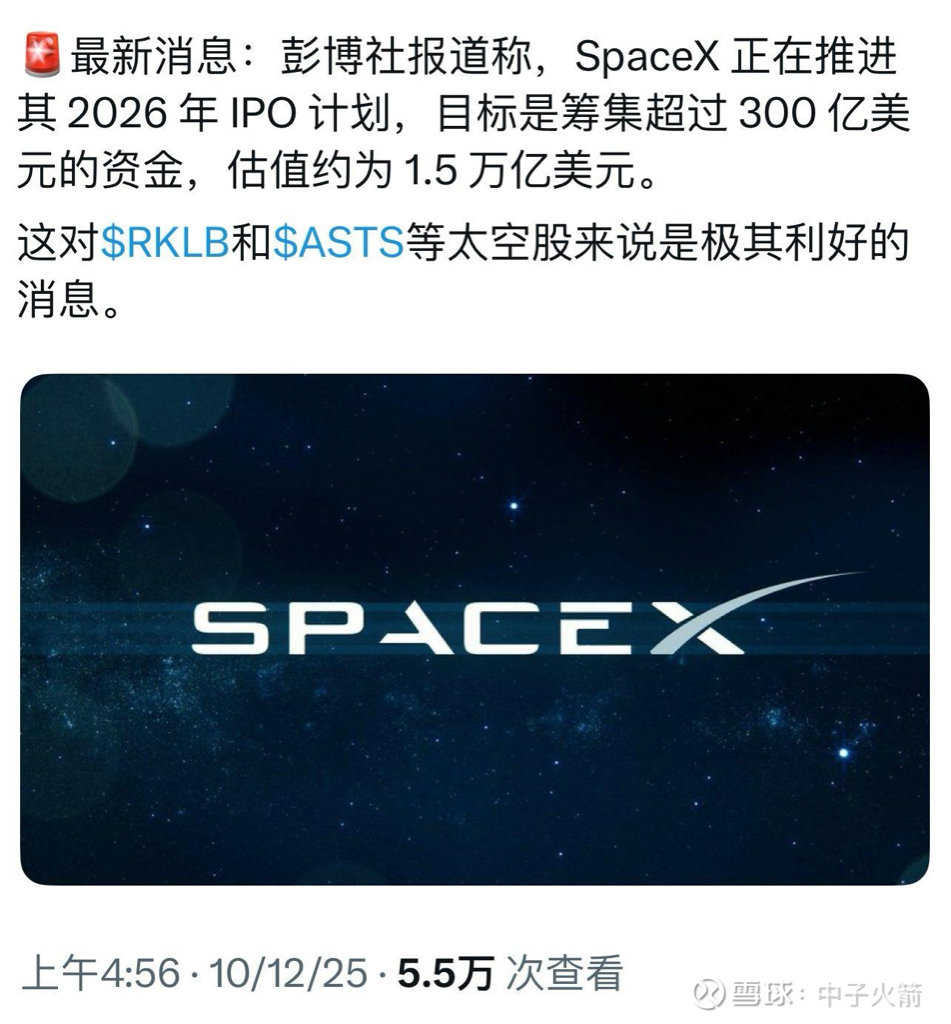 $崧盛股份(SZ301002)$ $Rocket Lab Corp(NASDAQ|RKLB)$ $Intuitive Machines Inc-A(NASDAQ|LUNR)$ 两个月前SpaceX的估值是8000亿,因为最近“太空数据中心”的热度上来,明年IPO的估值已经上升到1.5万亿了