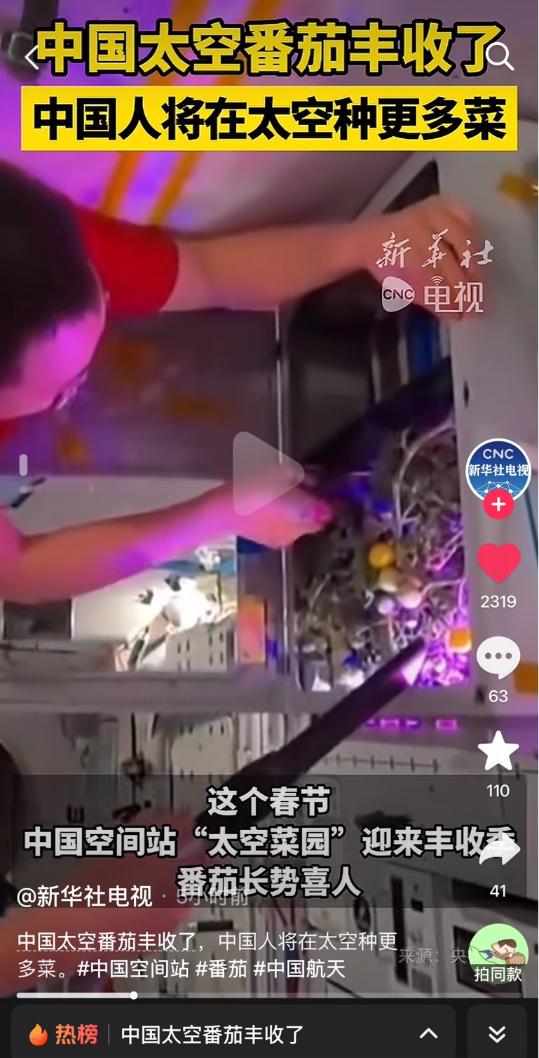 这个春节,中国空间站"太空菜园"丰收,神舟二十一号乘组培育的太空番茄长势喜人。该