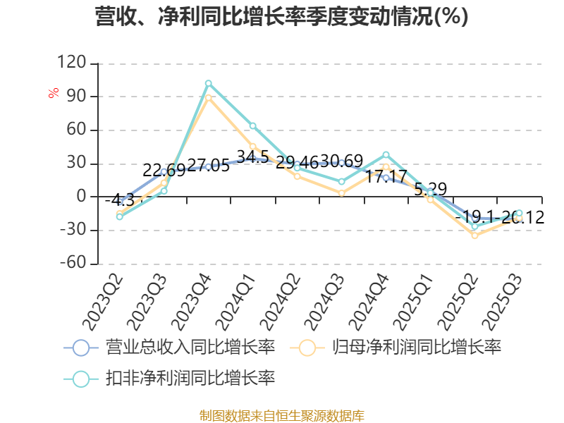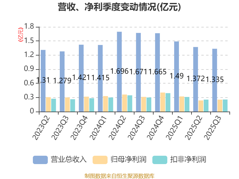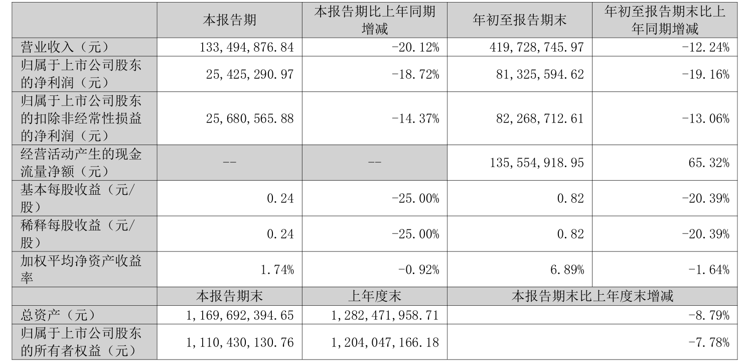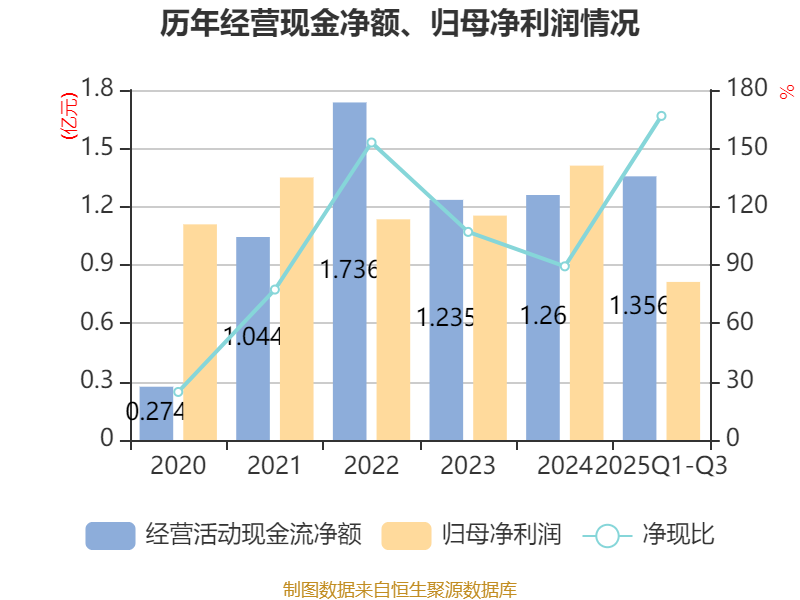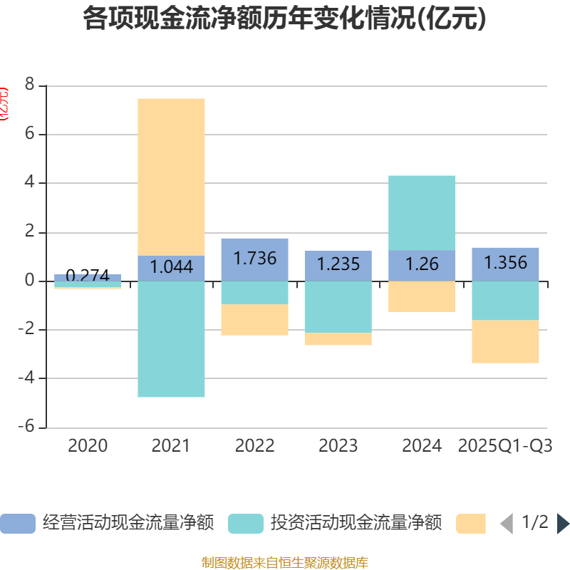 2025年前三季度,公司经营活动现金流净额为1.36亿元,同比增长65.32%;筹资活动现金流净额-1.75亿元,同比减少4707.73万元;投资活动现金流净额-1.61亿元,上年同期为2.73亿元。