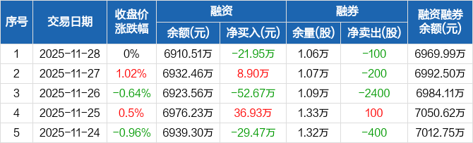 嘉益股份:融资净偿还21.95万元,融资余额6910.51万元(11-28)