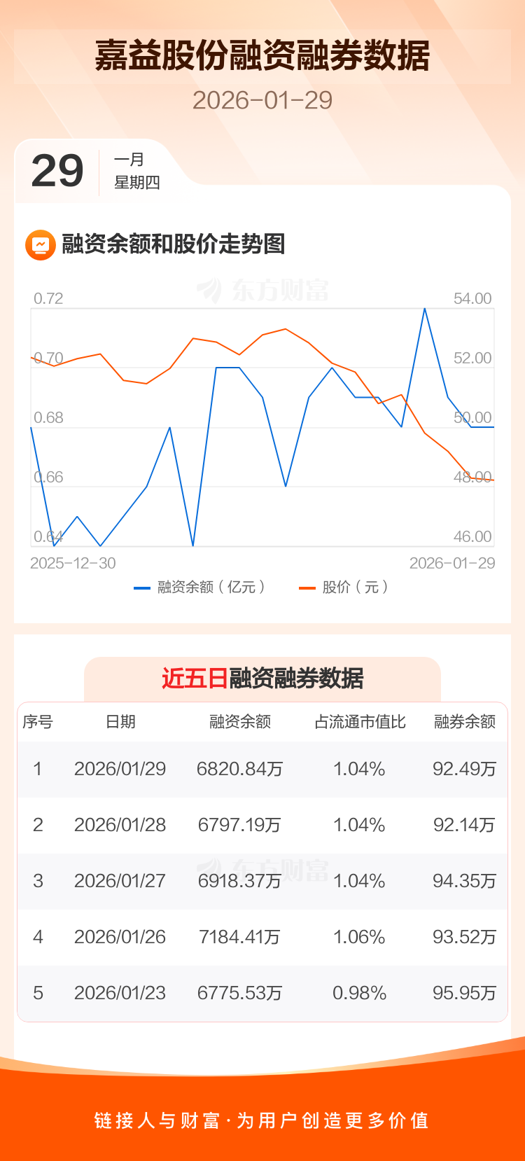 交易所最新数据显示,嘉益股份于2026年1月29日获融资买入410.32万元,融资偿还386.67万元,当日融资净买入23.65万元。目前,该股融资余额6820.84万,占流通市值比例为1.04%。