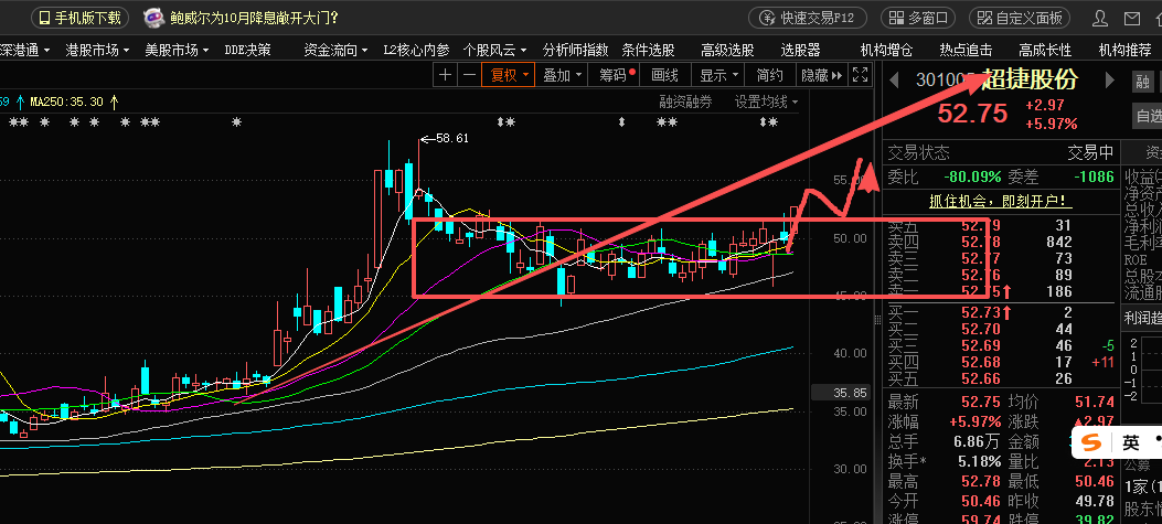 箱体中枢已经有效突破,只要回踩箱体不破,将会震荡向上,日线一笔中枢压力55附近