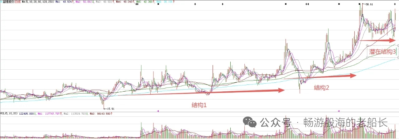 图中标注的大型结构1突破,意味着股价处在比较大的上涨趋势。结构2是结构1突破后的回踩,意味着后期有波段上涨。近期的震荡,构筑了潜在结构3,现在,股价运行到了结构3的上轨,有震荡是正常的。