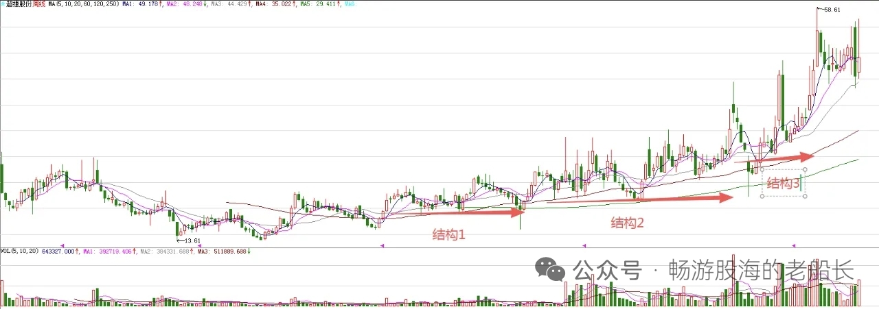 周线级别的走势来看,存在结构1,是根源性结构,意味着股价处在上涨趋势。结构2规模