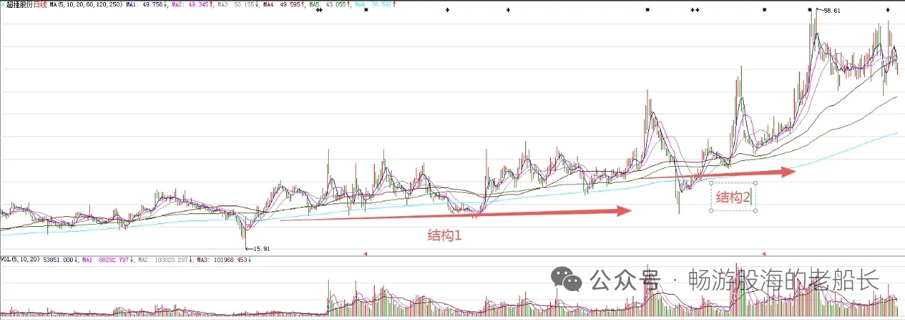 图中标注的大型结构1突破,意味着股价处在比较大的上涨趋势。结构2是结构1突破后的回踩,意味着后期有波段上涨。目前,中期调整已经到了尾声!!