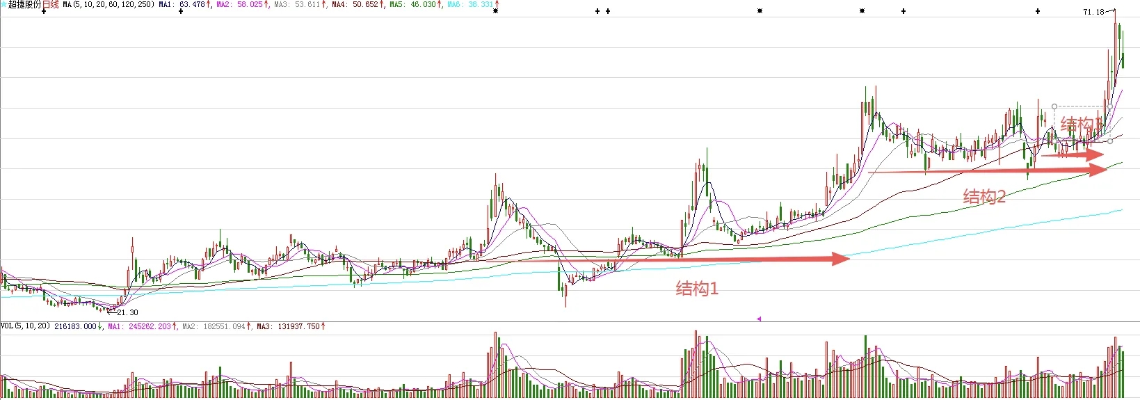 日线级别的而走上来看,走出了上影线比较长的阴线,释放了调整信号。周二,股价大概率继续调整。不过,这是日线级别走了九个有效上涨周期后带来的变盘节点,目标就是十日均线。所以,十日均线上方结束调整是大概率事件。图中标注的大型结构1突破,意味着股价处在比较大的上涨趋势。结构2和结构3突破,意味着波段上涨开始。短线完成调整周,波段上涨大概率还会继续。