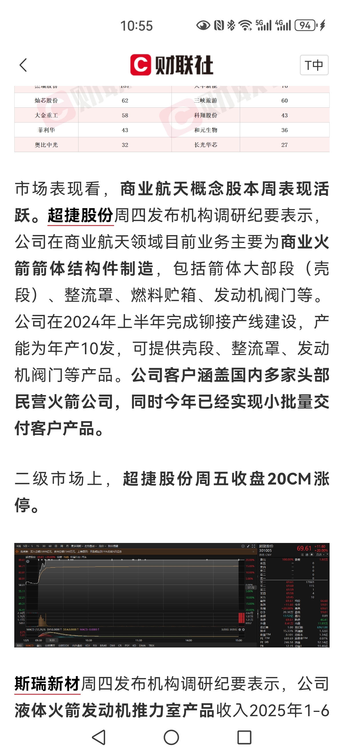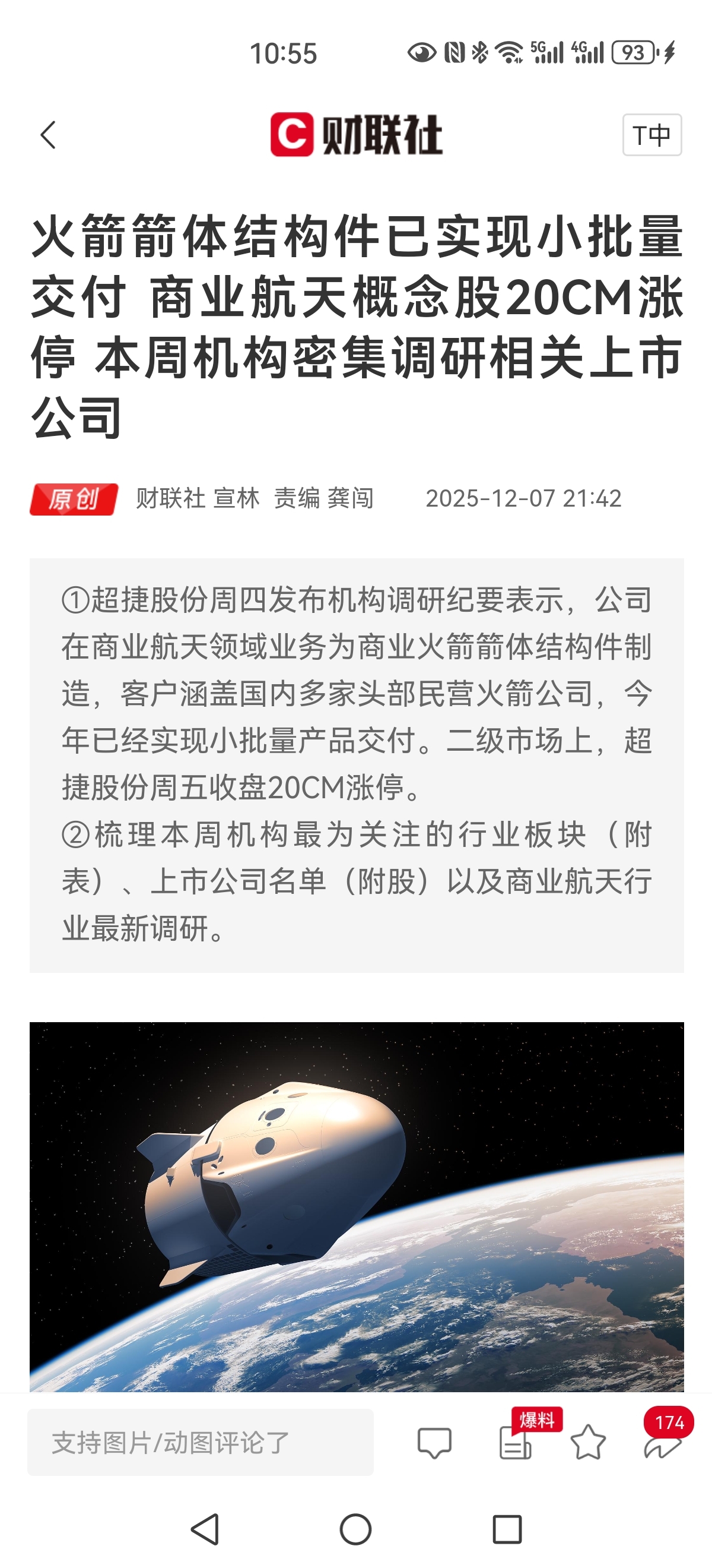 $超捷股份(SZ301005)$ 财联社 2025-12-07 21:42 超捷股份发布机构调研纪要表示,公司在商业航天领域业务为商业火箭箭体、整流罩等结构件制造,客户涵盖国内多家头部民营火箭公司,今年已经实现量产品交付。二级市场上,超捷股份周五收盘20CM涨停。