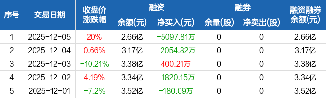 超捷股份融资融券信息显示,2025年12月5日融资净偿还5097.81万元;融资余额2.66亿元,较前一日下降16.08%。
