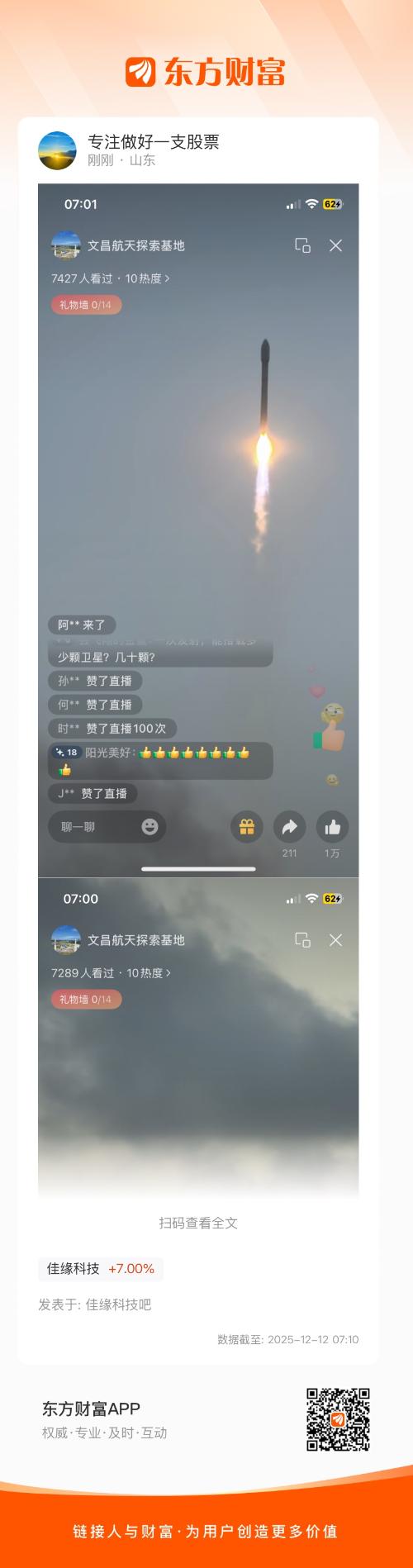 $佳缘科技(SZ301117)$ 长征十二号运载火箭刚刚7点发射成功,后续可回收长征十二号甲运载火箭这两三天会择机发射,长征十二号甲可回收运载火箭是重点。佳缘科技(支持系统)和超捷股份(壳体、整流罩等)都有参与是核心供应商看好!