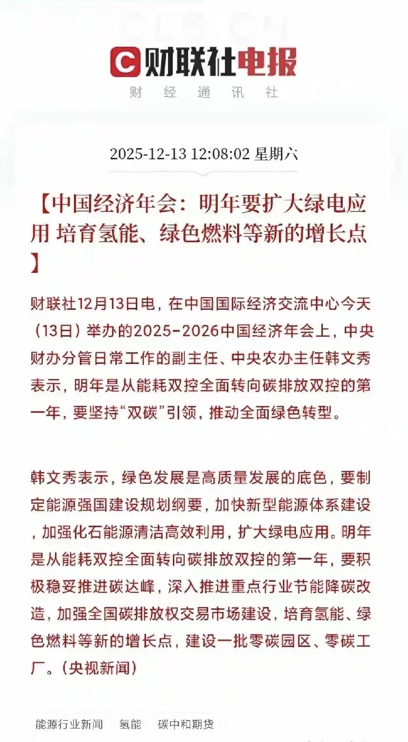 此次中国经济年会释放的绿色转型政策信号,明确了绿电、氢能、碳交易等领域的发展方向,政策驱动下相关产业链将迎来长期发展机遇。绿电运营、氢能全产业链、碳交易配套服务等细分领域的龙头企业,凭借技术、产能或业务布局优势,将充分受益于政策落地带来的需求增长。不过行业发展仍需关注政策执行节奏、技术突破进度以及企业业绩兑现能力,长期来看绿色能源转型的成长逻辑明确,细分赛道龙头具备持续发展潜力。