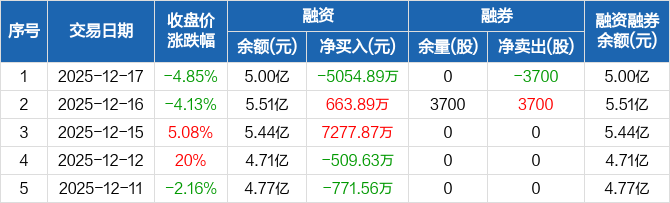 超捷股份:融资净偿还5054.89万元,融资余额5亿元(12-17)