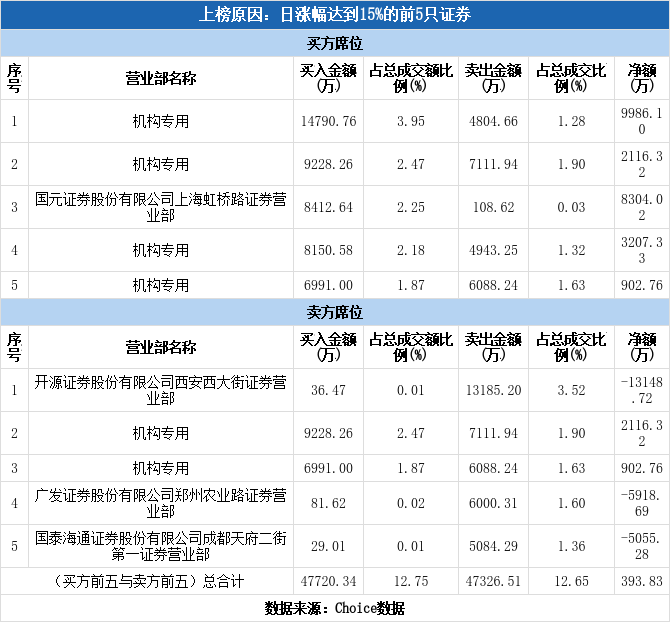 龙虎榜数据显示,今日共6个机构席位出现在龙虎榜单上,分别位列买一、买二、买四、买五、卖二、卖三,合计净买入1.62亿元,占龙虎榜净买额的4116.62%。除此之外还有海南发展、西部材料、天际股份等34只个股榜单上出现了机构的身影,其中14家呈现机构净买入,获净买入最多的是海南发展,净买额为2.89亿元;20家呈现机构净卖出,其中遭净卖出最高的为天际股份,净卖额为2.13亿元。