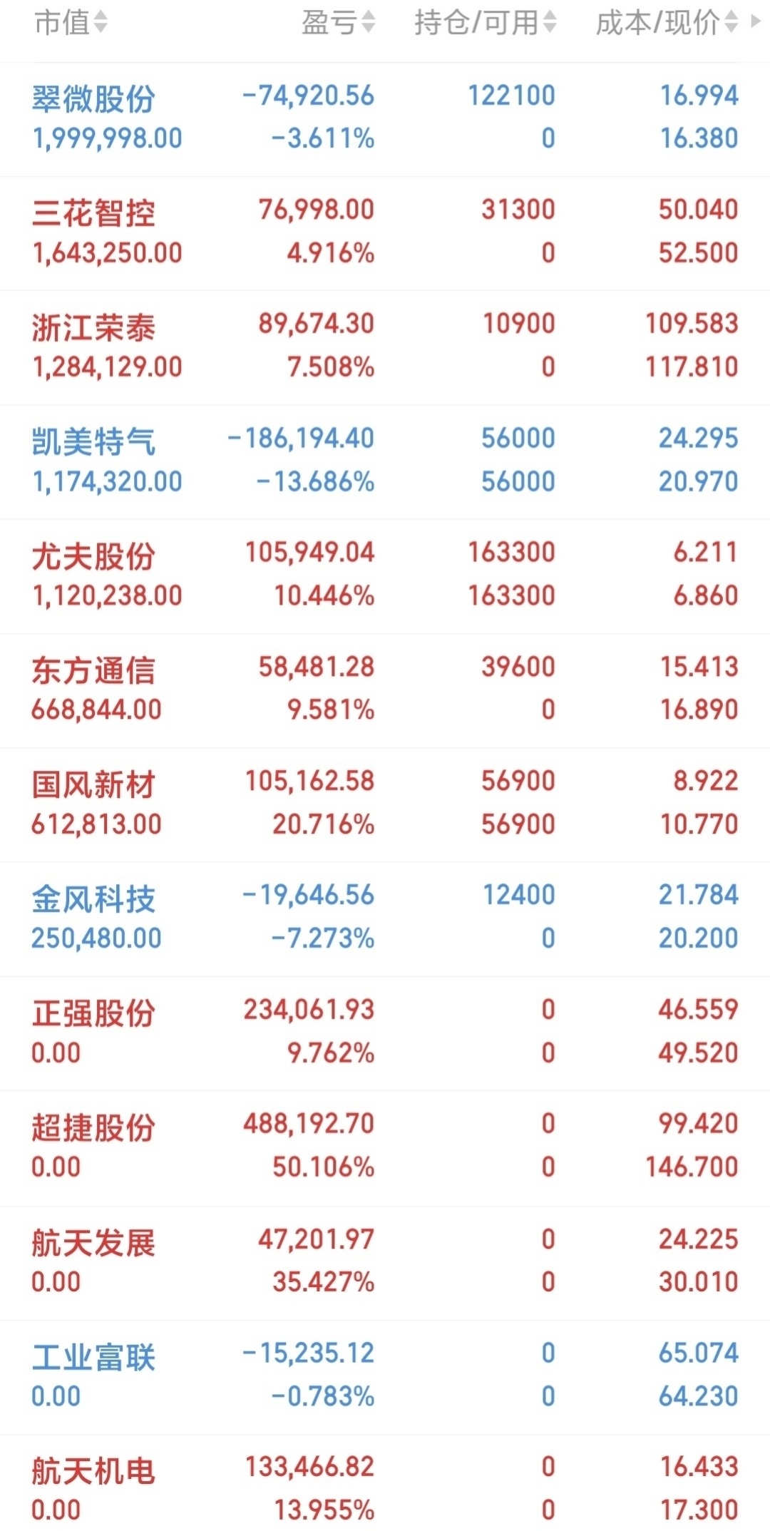 12月30日周二收盘持仓