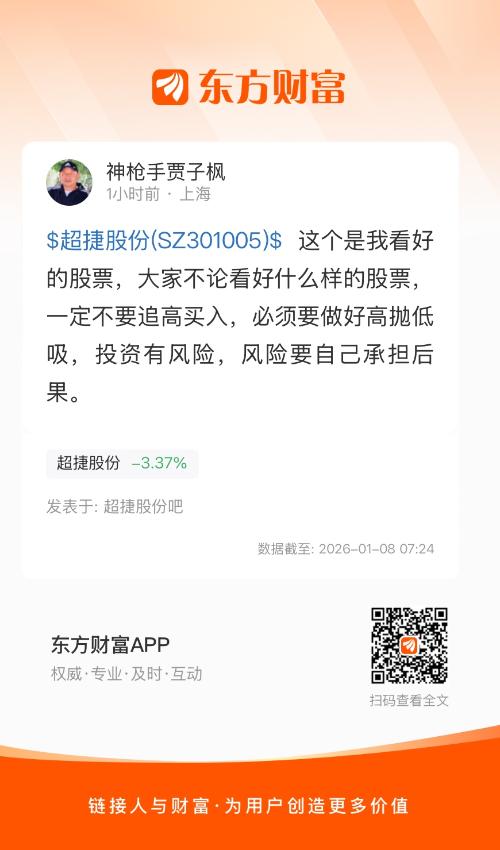 $超捷股份(SZ301005)$ 这个是我看好的股票,大家不论看好什么样的股票,一定不要追高买入,必须要做好高抛低吸,投资有风险,风险要自己承担后果。