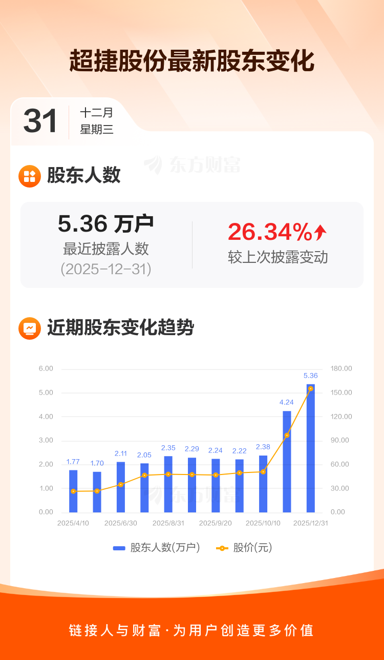 超捷股份最新披露数据显示,截至12月31日公司股东户数为5.36万户,较上期(2025年12月20日)增加1.12万户,增幅为26.34%。户均持有流通股数量由上期的3120股下降至2469股,户均持股金额由上期的30.19万元增加至38.35万元。
