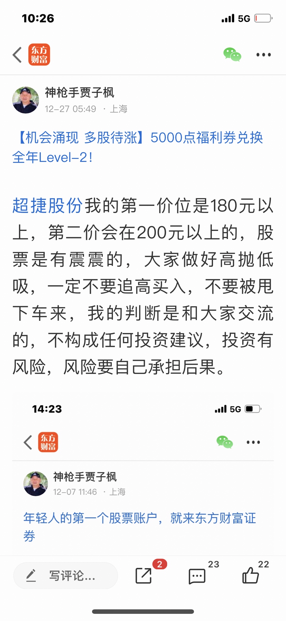 $超捷股份(SZ301005)$ 这个股我是十二月七号发表文章看涨的股票,十二月二十三号早上八点十分发帖了今天开始反弹,很快就会大涨的股票,这个股以涨幅很多了,有股的可以先减仓,控制好仓位,做好高抛低吸,我是不推荐股票的,大家不要跟我买卖股票,大家自己买什么样的股票是和我无关的,我的观点仅供大家参考,