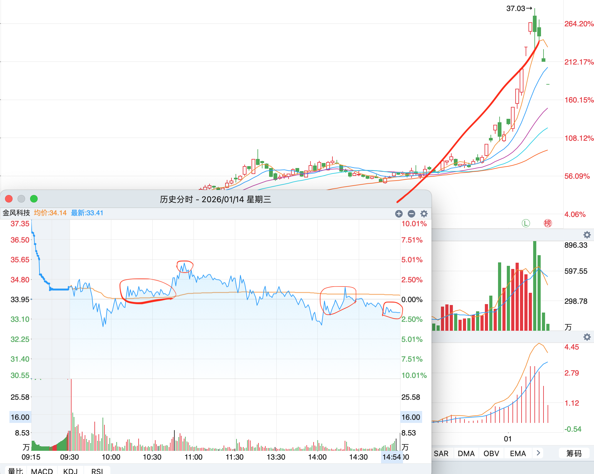 放上与金风科技的日K及14日的分时图,自己判断……