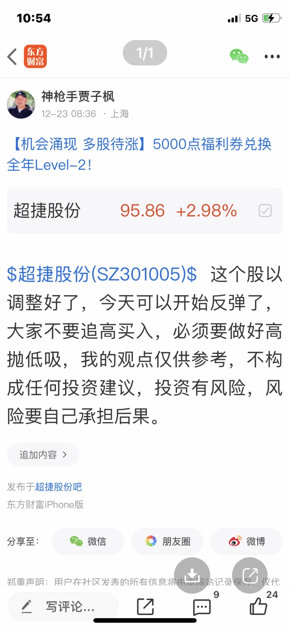 $超捷股份(SZ301005)$ 这个股是有震荡的股票,必须要做好高抛低吸,我是十二月七号发表看好的股票,我是不推荐股票的,大家自己买什么样的股票是和我无关的,我的观点仅借,投资有风险,风险要自己承担后果,