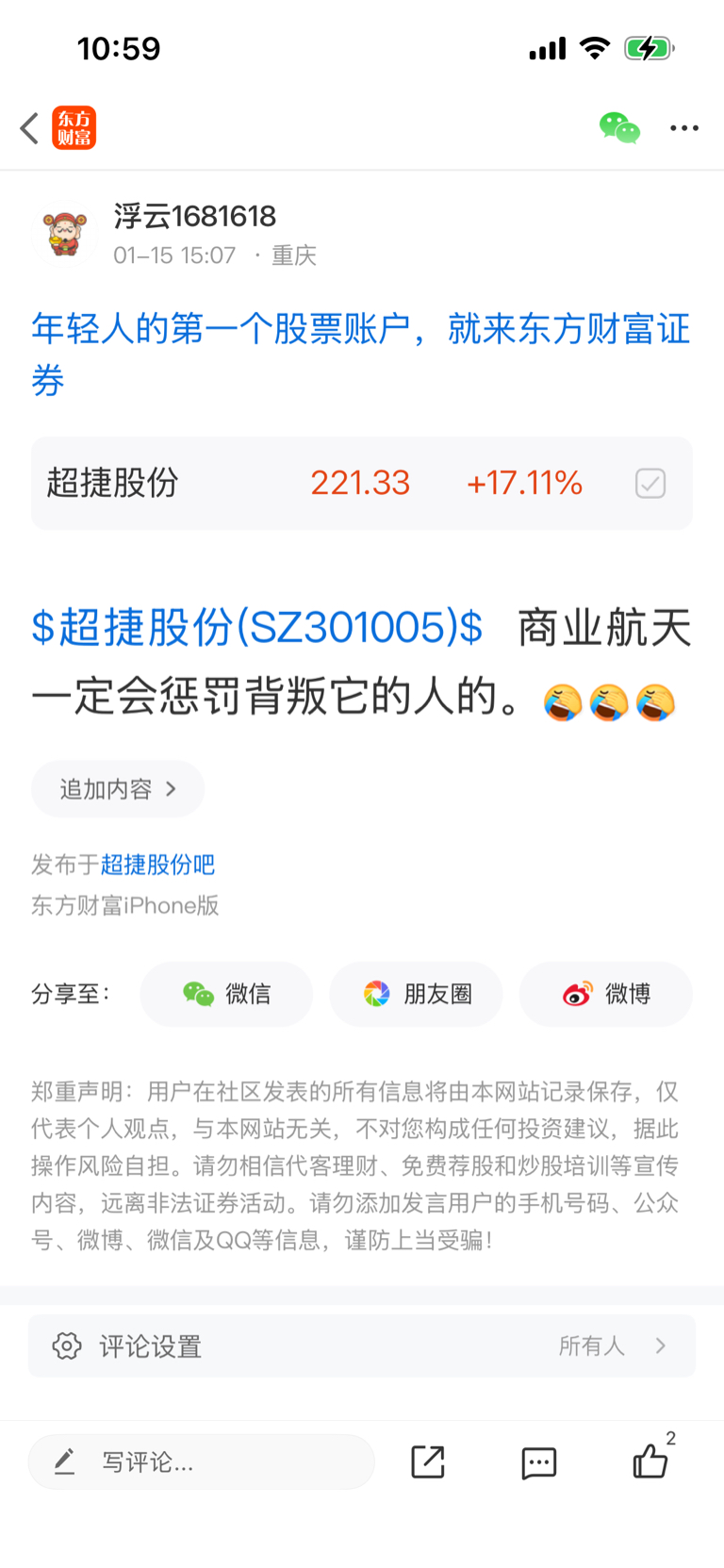 温馨提示: 1.根据《证券法》规定,禁止编造、传播虚假信息或者误导性信息,扰乱证券市场;2.用户在本社区发表的所有资料、言论等仅代表个人观点,与本网站立场无关,不对您构成任何投资建议。用户应基于自己的独立判断,自行决定证券投资并承担相应风险。《东方财富社区管理规定》
