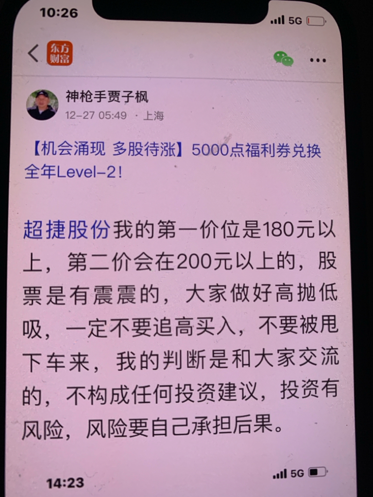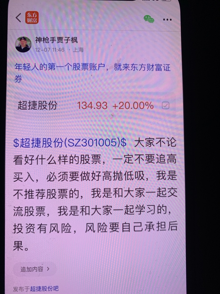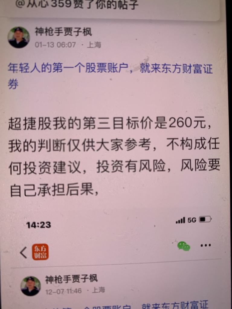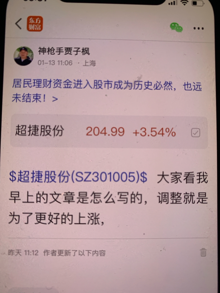 $超捷股份(SZ301005)$ 这个股我是十二月七号发表文章看好的股票,十二月二十三号早上八点十分发表当天开始反弹的股票,很快就会大涨的股票,第二天连拉了两个涨停板,我当时的判断第一价位是180元、第二价位是200元,第三价位我是看到260元,大家可以看我发表文章的时间,