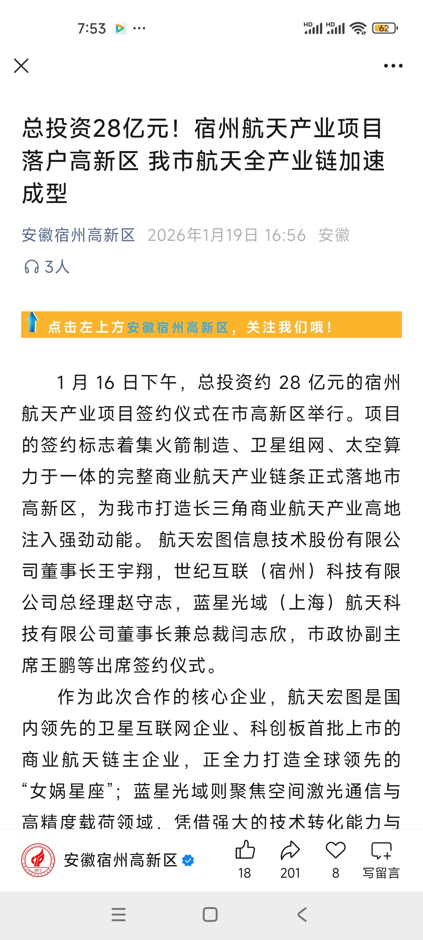 航天宏图688066经查验消息属实,消息来自宿州高新区官网。