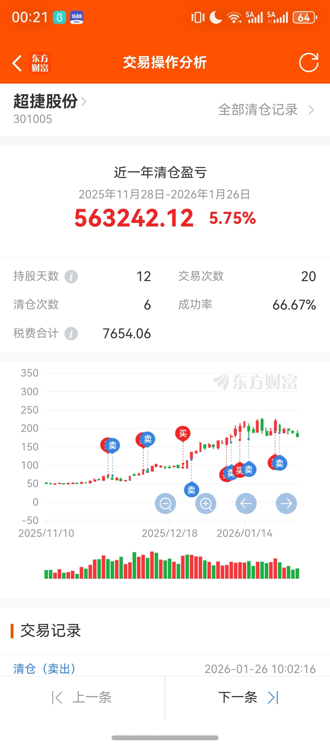 $超捷股份(SZ301005)$ 感谢超姐这一轮商业航天行情,在超姐收了快70个米.昨天今天跌这么狠的行情还给我6个米,感恩!估计要调整一段时间了,低吸是真的舒服,但是总是喜欢追高,今天追了协创数据,希望也能吃点肉肉