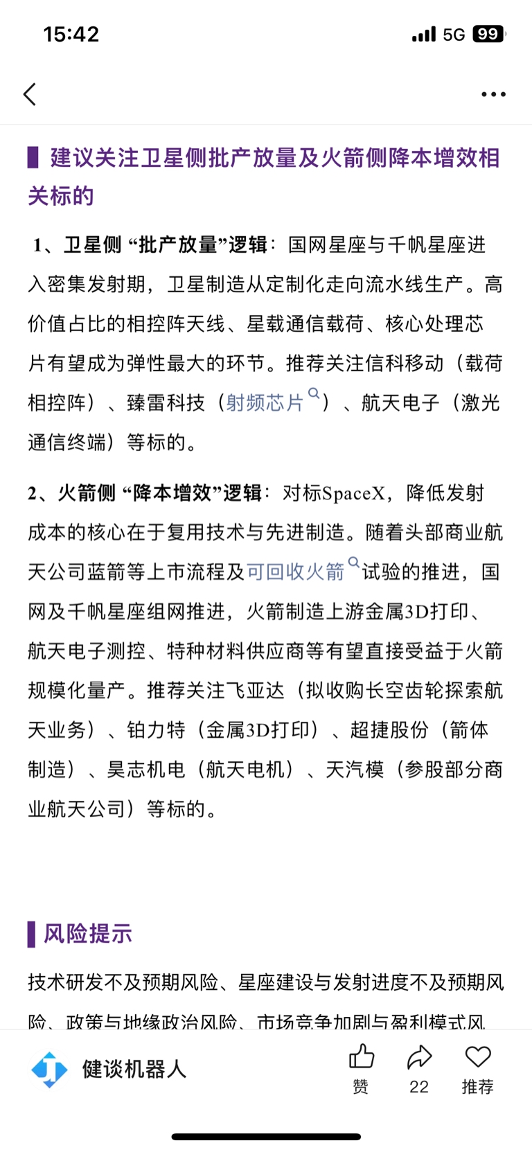 $超捷股份(SZ301005)$ 华鑫证券行业深度报告《空天资源紧缺,商业航天业务有望爆发》,推荐飞亚达(拟收购长空齿轮探索航天业务)、铂力特(金属3D打印)、超捷股份(箭体制造)、昊志机电(航天电机)、天汽模(参股部分商业航天公司)等标的。