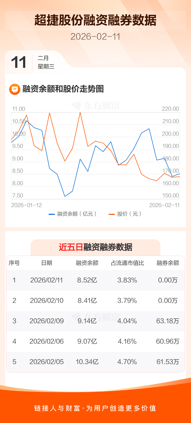 交易所最新数据显示,超捷股份于2026年2月11日获融资买入2.55亿元,融资偿还2.44亿元,当日融资净买入1120.15万元。目前,该股融资余额8.52亿,占流通市值比例为3.83%。