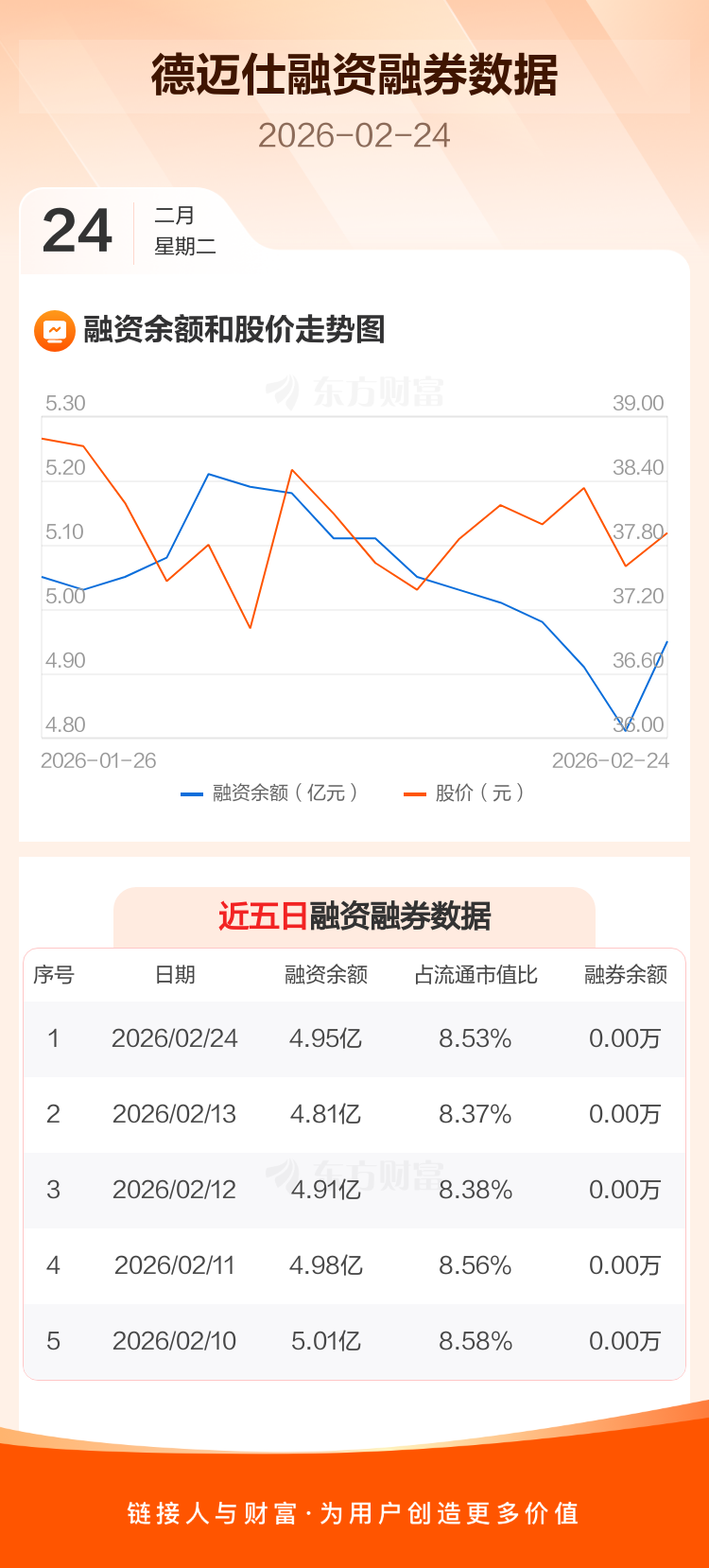 交易所最新数据显示,德迈仕于2026年2月24日获融资买入2661.04万元,融资偿还1300.28万元,当日融资净买入1360.76万元。目前,该股融资余额4.95亿,占流通市值比例为8.53%。
