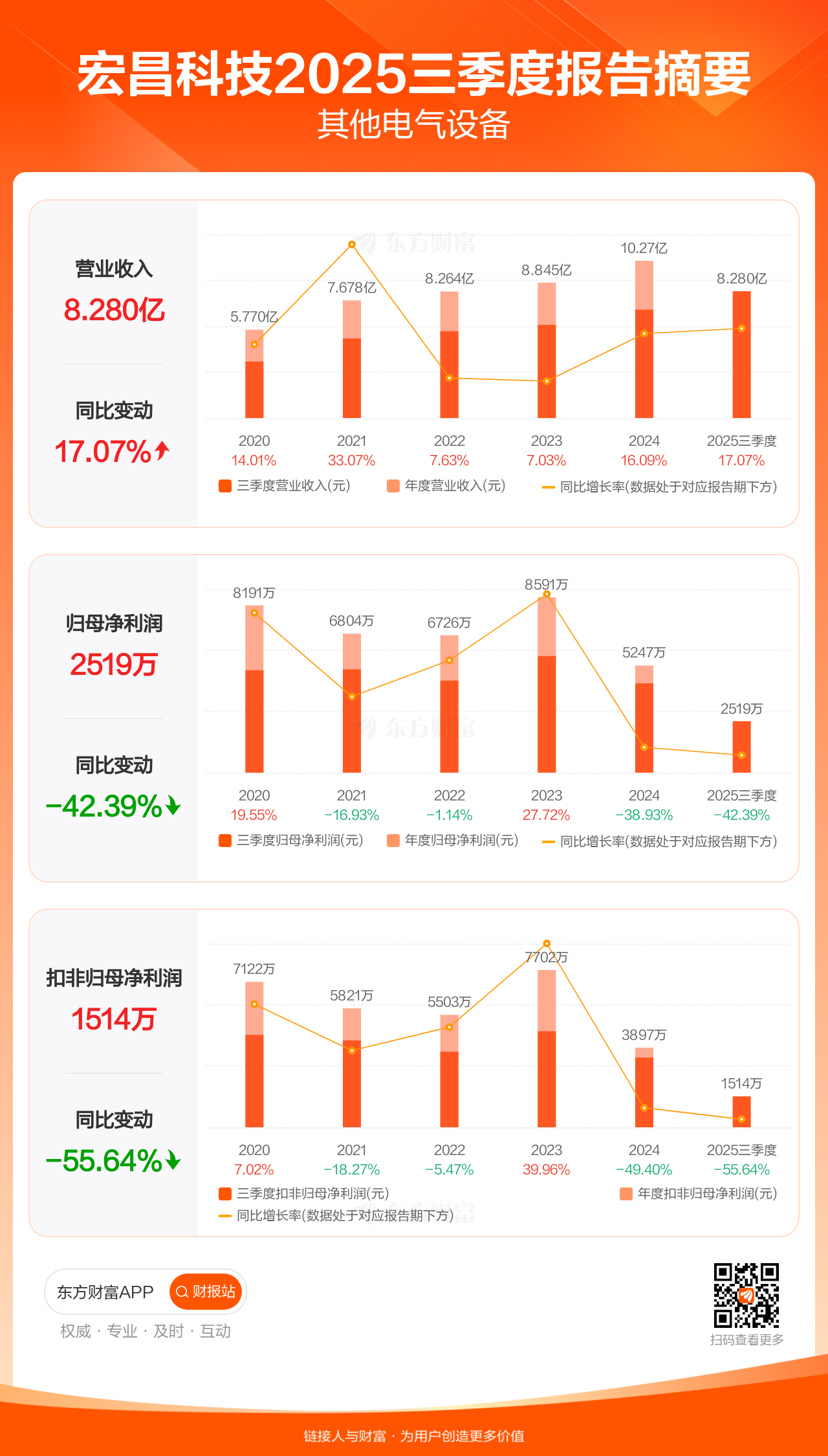 宏昌科技10月30日发布2025年三季报显示,公司前三季实现营业收入8.28亿元,同比增长17.07%;归母净利润2518.84万元,同比下滑42.39%;扣非归母净利润1514.08万元,同比下滑55.64%。