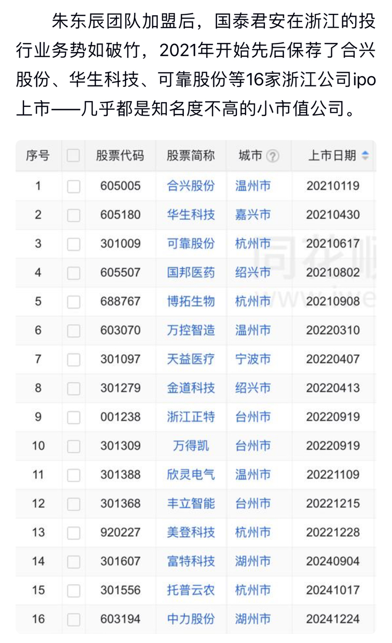 国泰君安2021年开始先后保荐了合兴股份、华生科技、可靠股份等16家浙江公司ipo上市——几乎都是知名度不高的小市值公司。