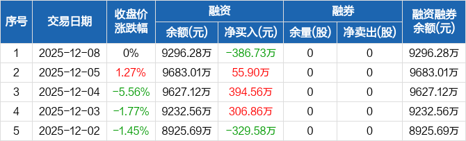 可靠股份:融资净偿还386.73万元,融资余额9296.28万元(12-08)