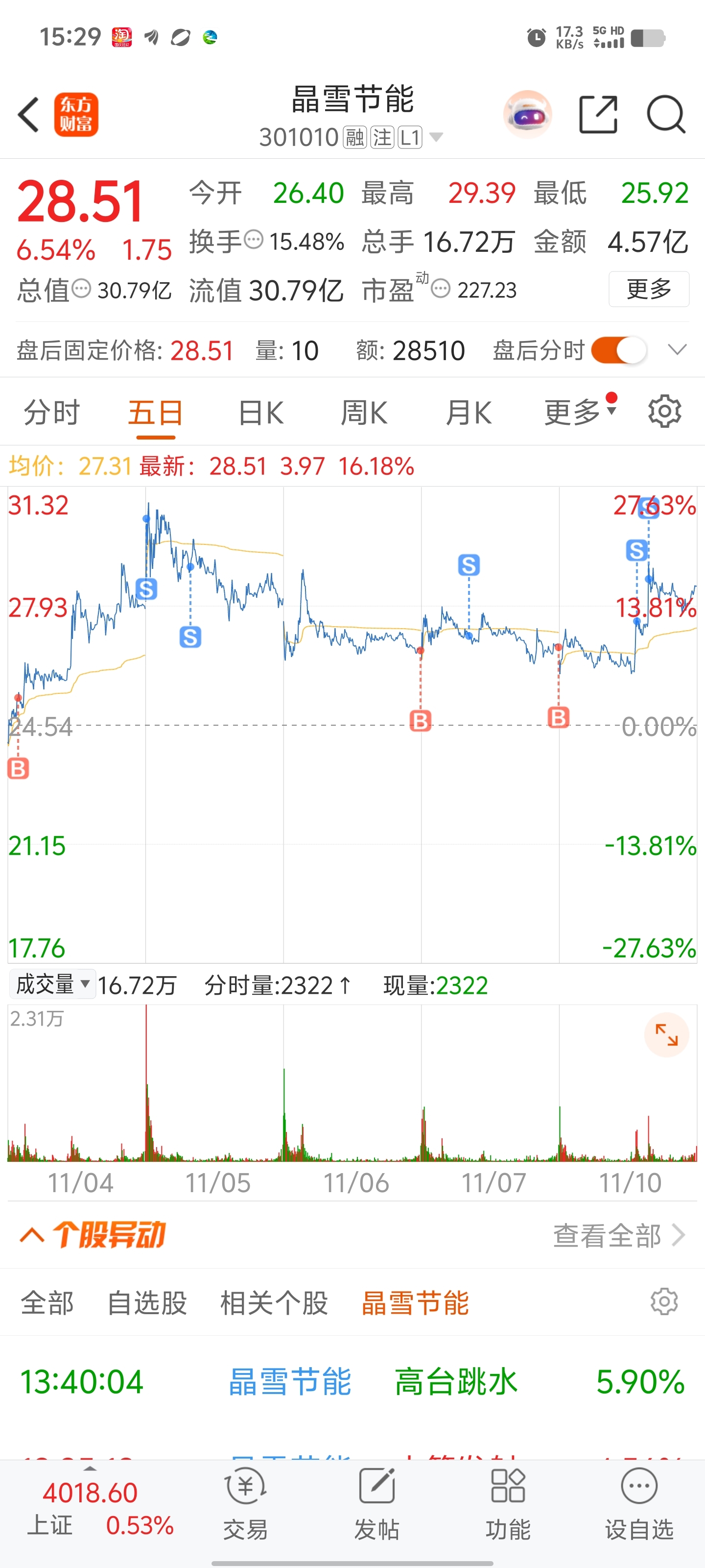 $晶雪节能(SZ301010)$ 陪主力斗智斗勇5天盈利二十多个点,走了,回调再进