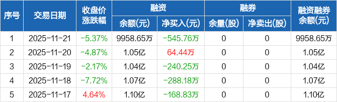 晶雪节能:融资净偿还545.76万元,融资余额9958.65万元(11-21)