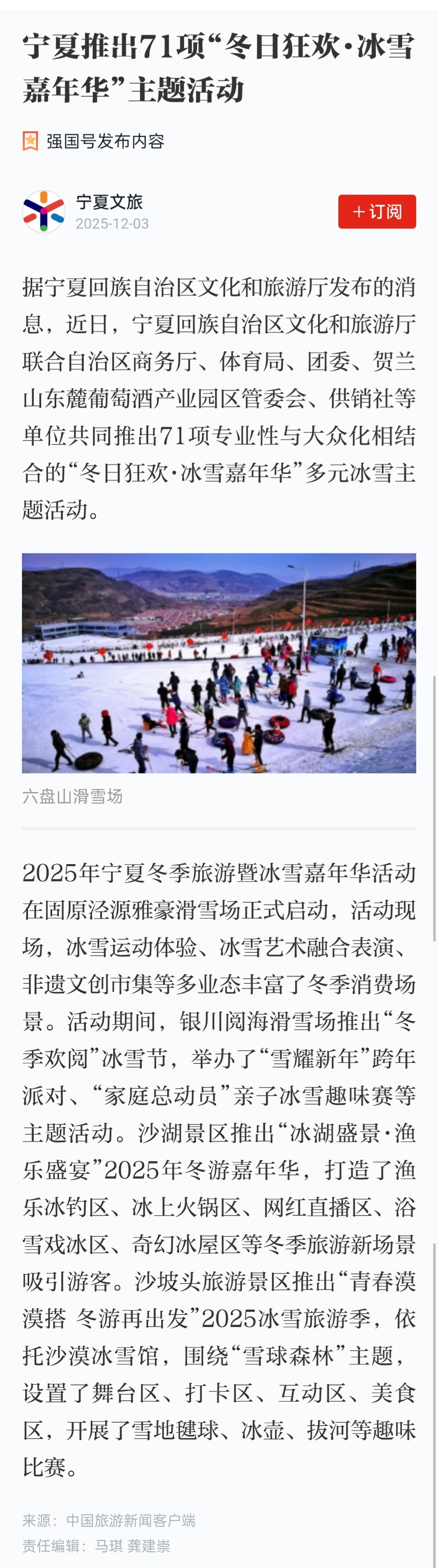 【宁夏文旅】推出71项“冬日狂欢·冰雪嘉年华”主题活动