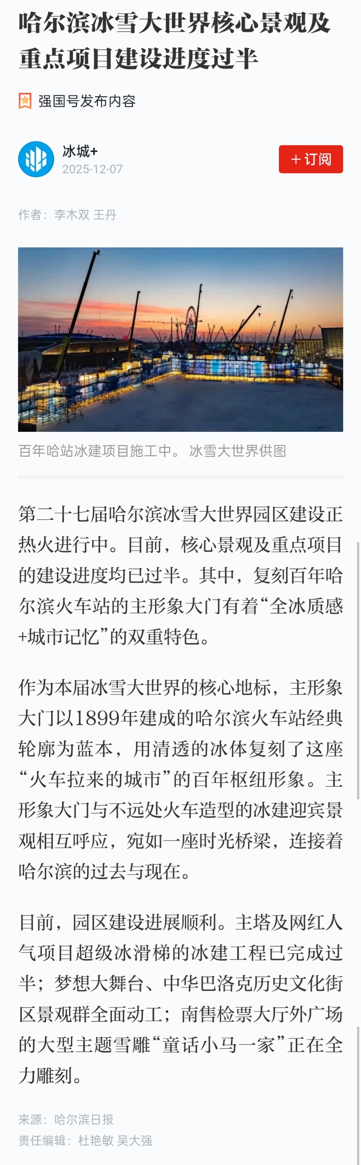 哈尔滨冰雪大世界核心景观及重点项目建设进度过半