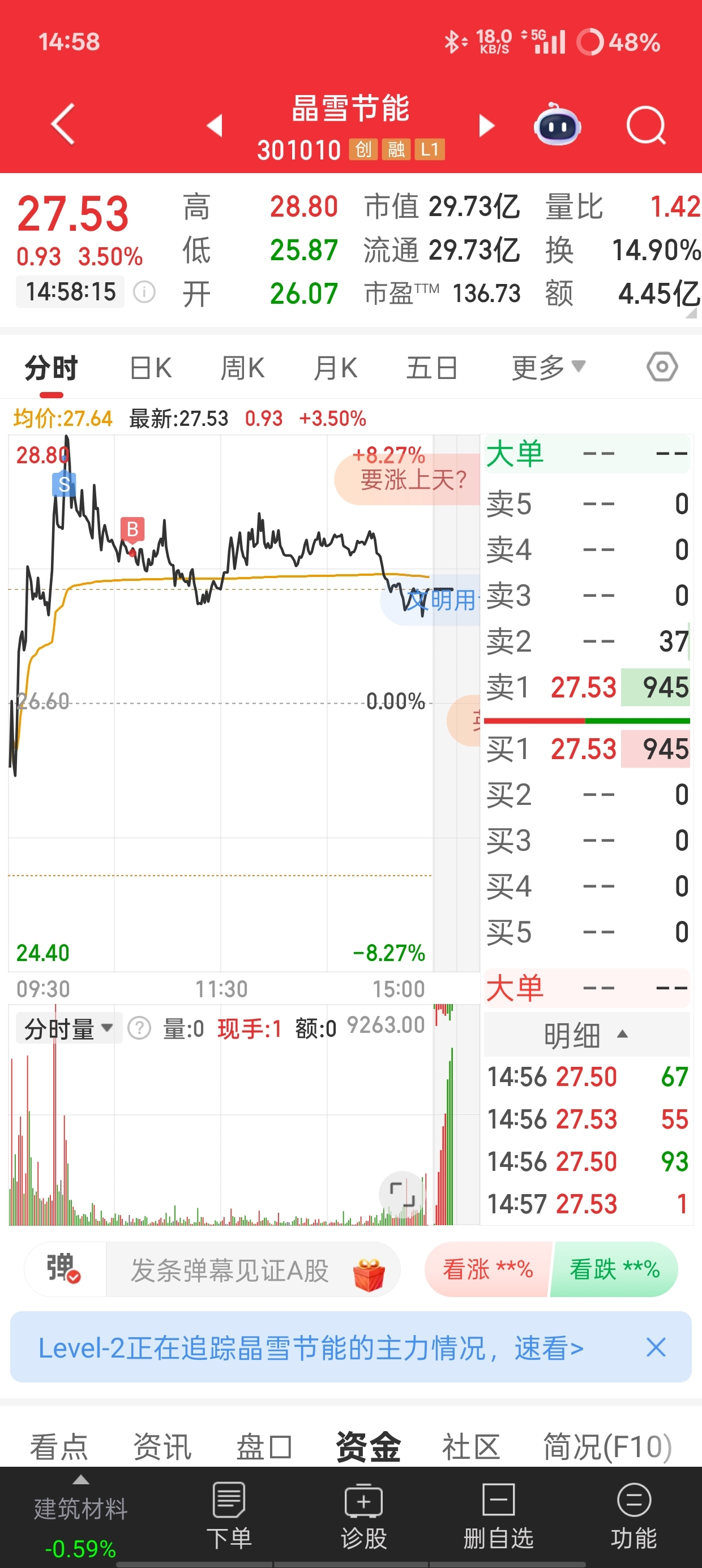 $晶雪节能(SZ301010)$ 拿了两周了,周一给个机会让我跑,唉,后悔今天没全挂上出了,本来加进去准备拉高T,谁知道这么拉稀!!!