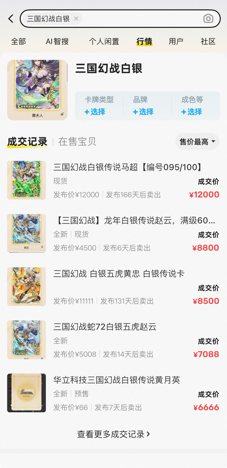 二手平台三国幻战白银传说卡的高阶卡交易记录。有买卖有成交,国内ip有这成绩的不多
