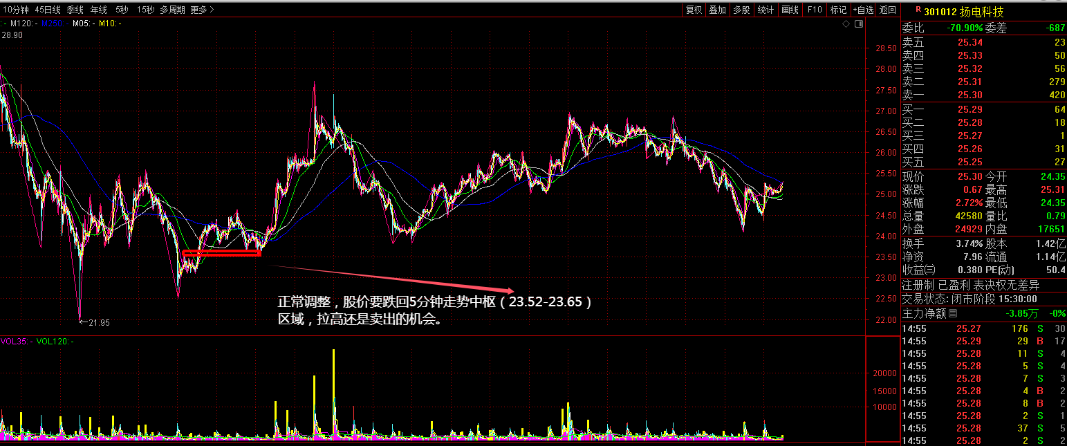 5分钟走势分解来看,下方有个中枢(23.52-23.65),正常股价要跌回这个买