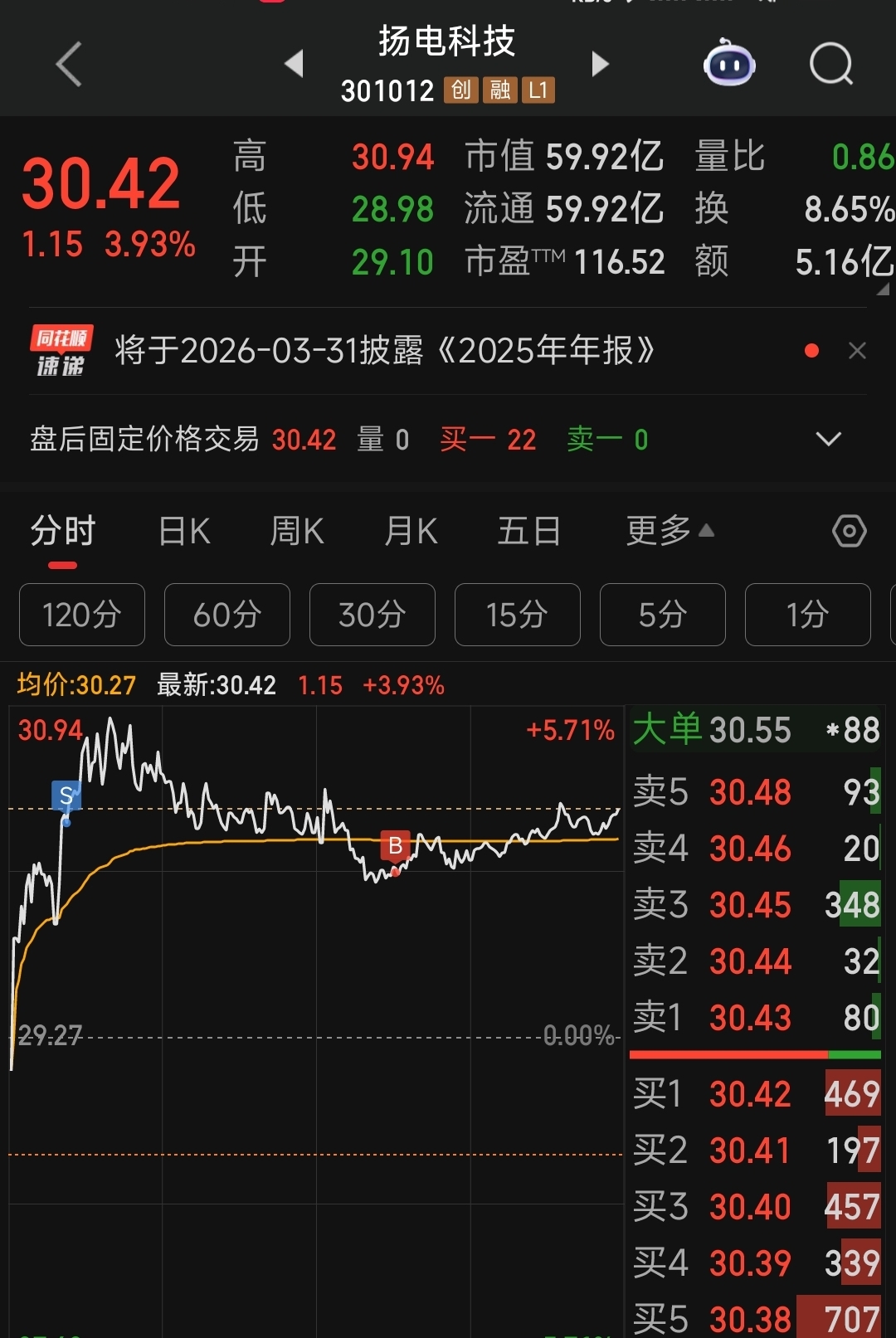 2、扬电科技,这波早上我个人是冲高做高抛,下午回踩又接回来了,不到2个点的T,也可以了,3天6个点,这里的扬电的仓位继续拿,应该还有更高的肉吃。