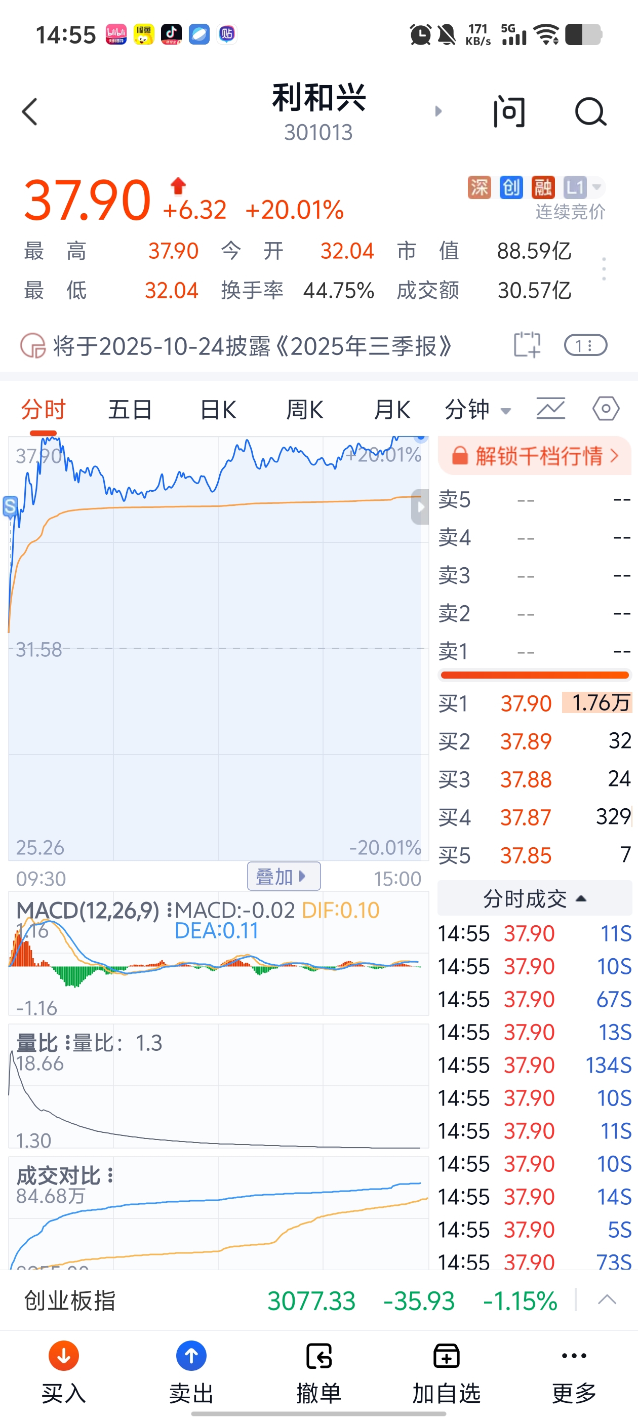 $利和兴(SZ301013)$ 可惜了 只赚了10多个点 ,被大盘吓跑了
