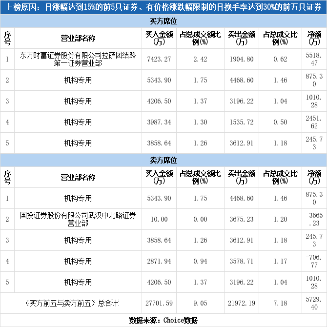 龙虎榜数据显示,今日共8个机构席位出现在龙虎榜单上,分别位列买二、买三、买四、买五、卖一、卖三、卖四、卖五,合计净买入3876.16万元,占龙虎榜净买额的67.65%。