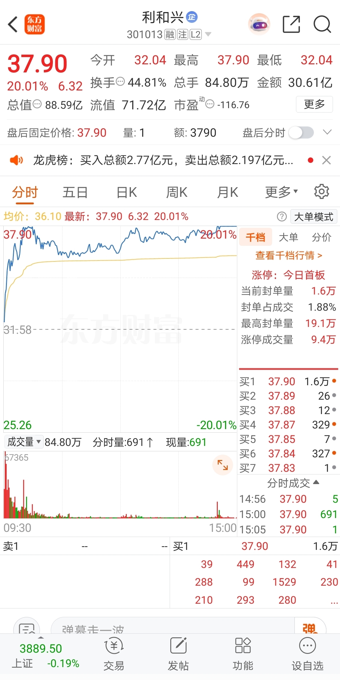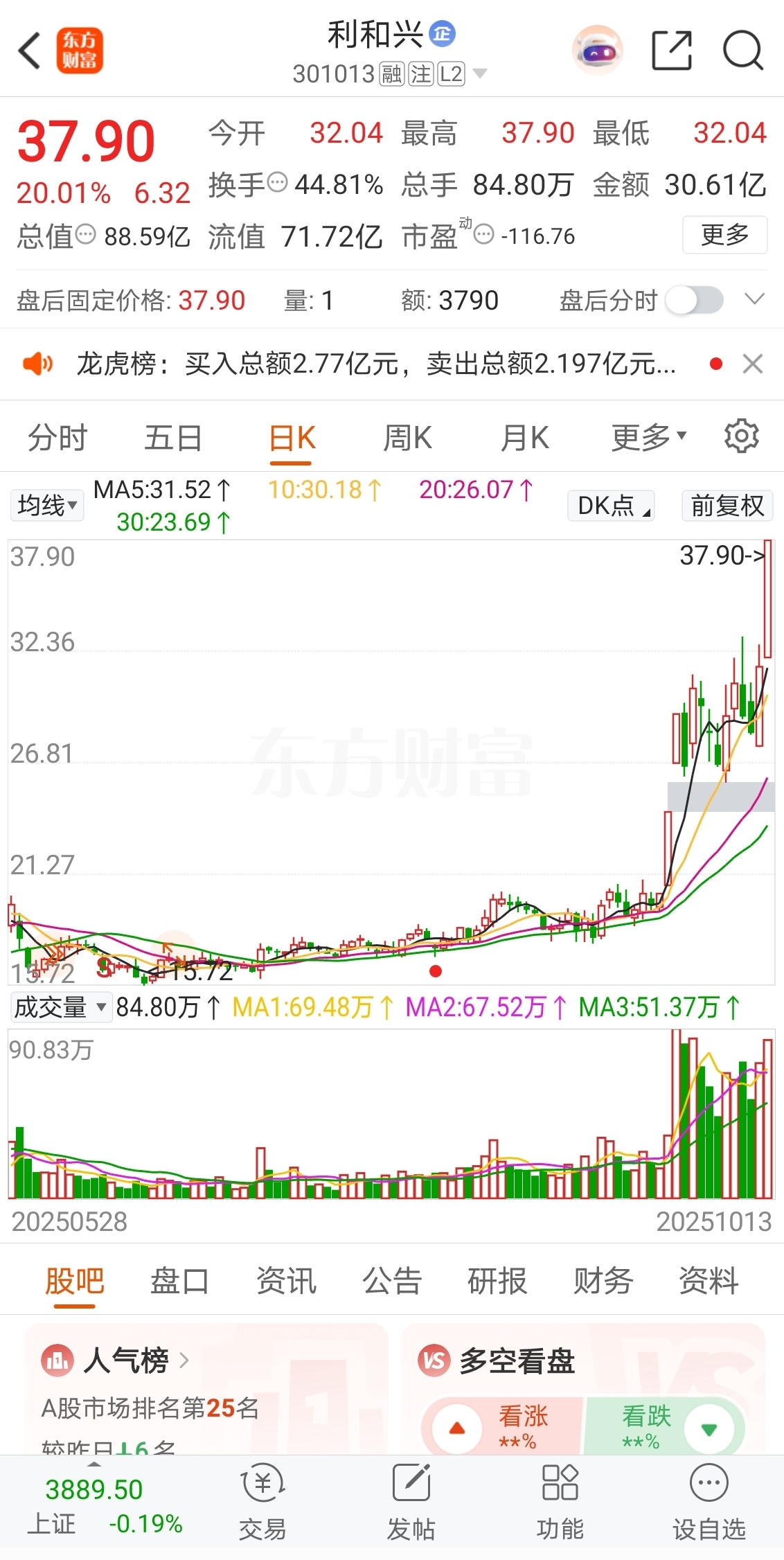 2025-10-13选择在20CM涨停板价格37.90卖出。