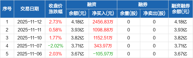 融资方面,当日融资买入8147.07万元,融资偿还5690.23万元,融资净买入2456.83万元,连续4日净买入累计5052.19万元。融券方面,融券卖出0股,融券偿还0股,融券余量0股,融券余额0元。融资融券余额合计4.18亿元。