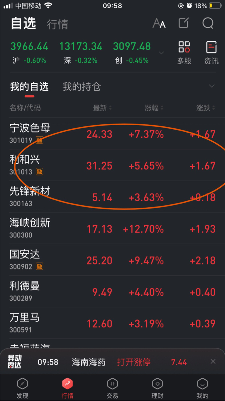 $利和兴(SZ301013)$ $先锋新材(SZ300163)$ $宁波色母(SZ301019)$ 这三只!是今天看好的!其他人不要瞎跟哈!那个瞎追,套了黑老子身上,我昼他!我看好是我的事!这几只上周就留意了的!最看好的300300已经涨高了!没必要再发表观点了!