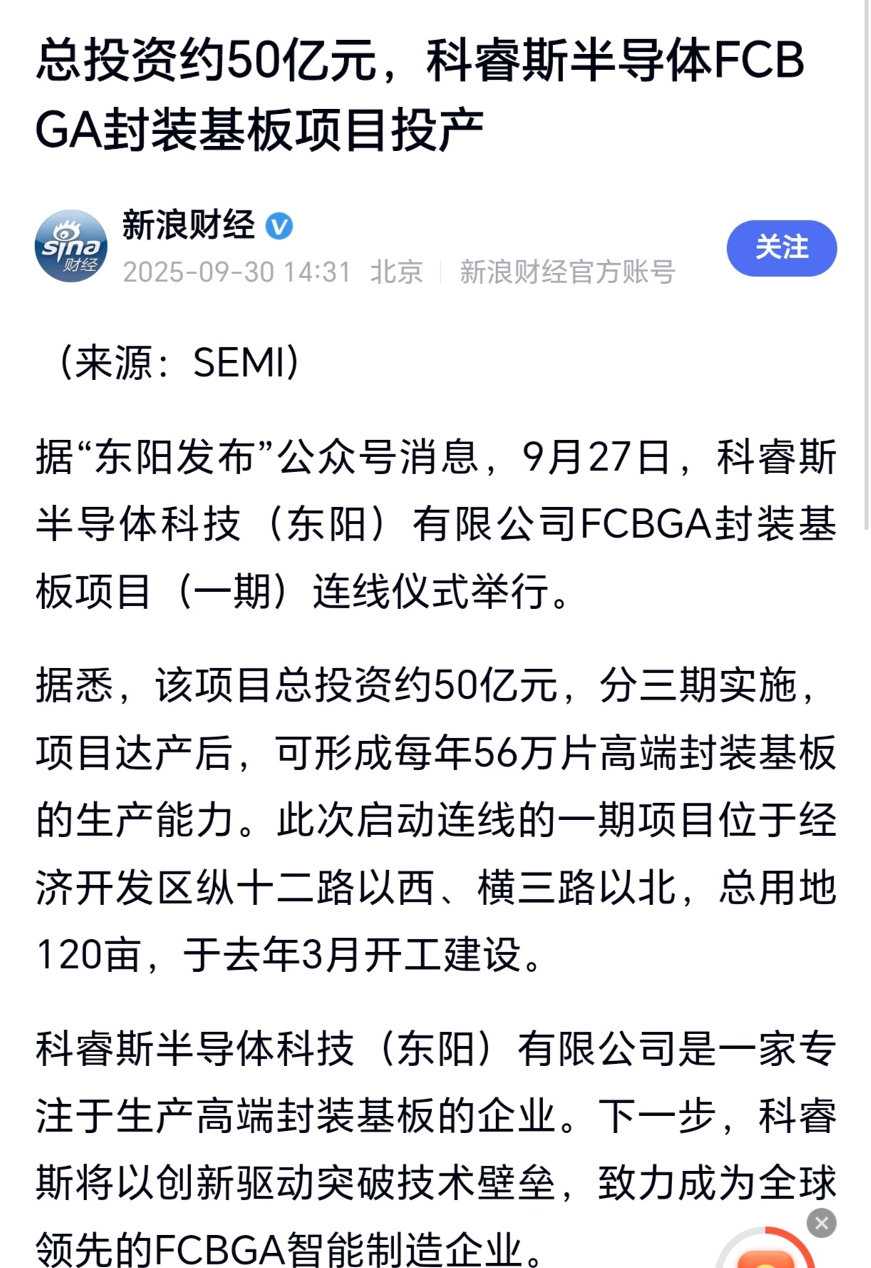 根据公开信息,科睿斯半导体科技(东阳)有限公司FCBGA封装基板项目(一期)于2025年9月27日举行连线仪式,标志着这一总投资约50亿元的重大项目正式投产。