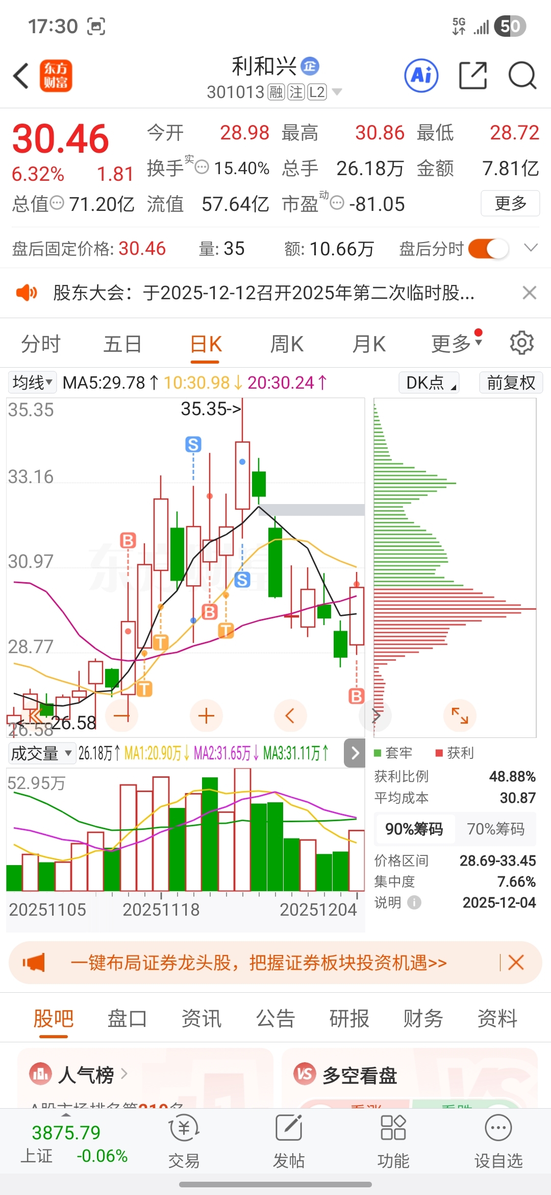 $利和兴(SZ301013)$ 今天又回来了不知对错,上次29进的。今天30追高进来的。